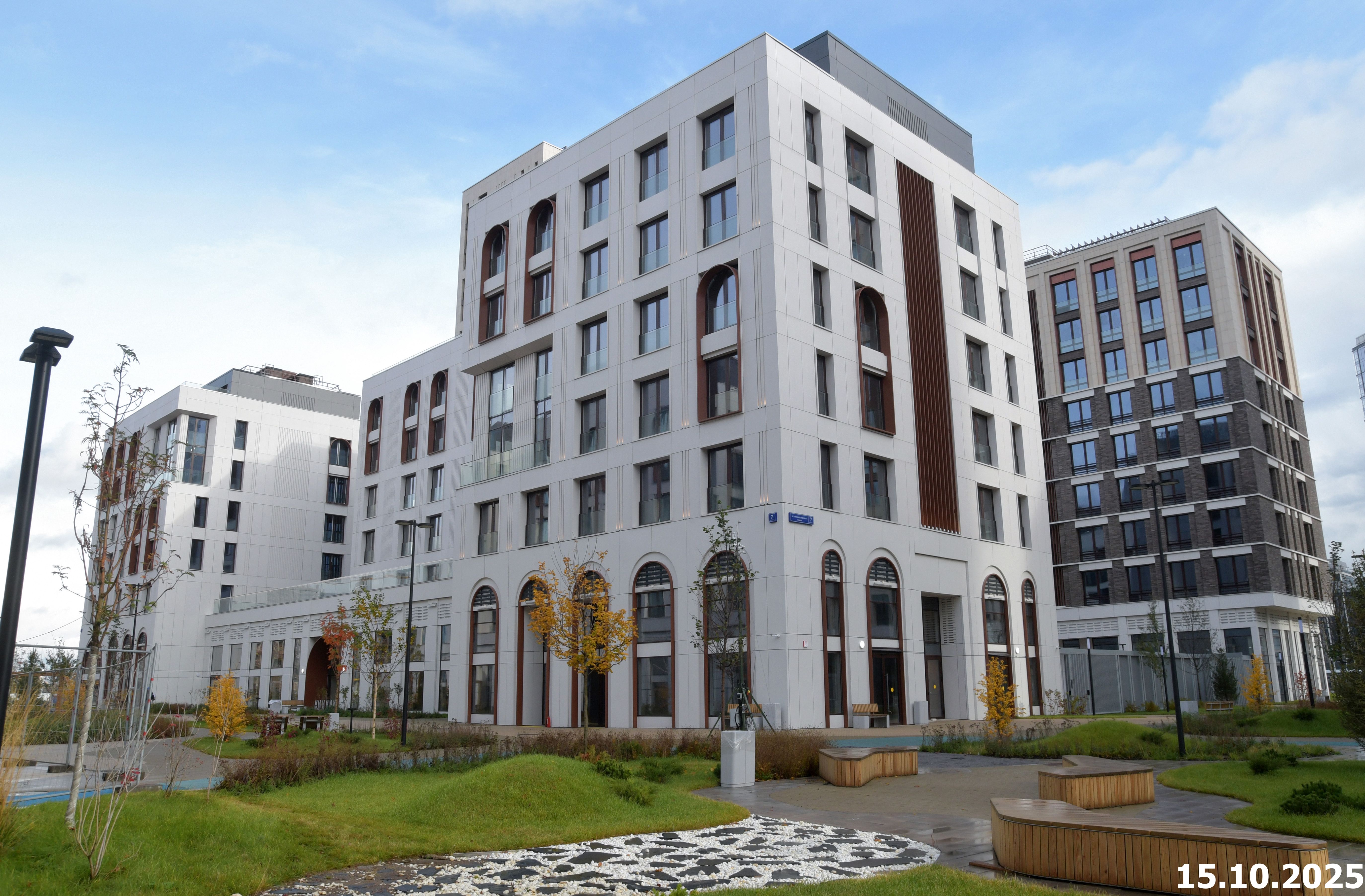 В конструкции наружных стен применяется система вентилируемого фасада. В качестве основного облицовочного материала комплекса используется – панели из стеклофибробетона для корпуса 3 и 4; и второго основного материала - бетонная фасадная плитка «под кирпич» для корпуса 4. Здания преимущественно решены в светлых тонах, а часть секций корпуса 4 выполнены темными тонами.